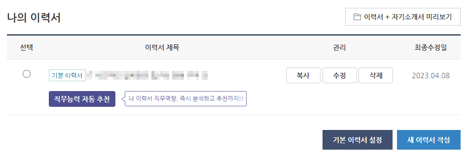 이력서·자기소개서 관리 탭에서 작성한 이력서를 확인할 수 있다.