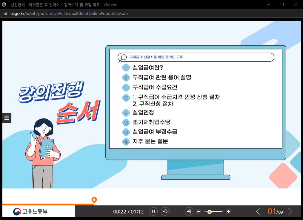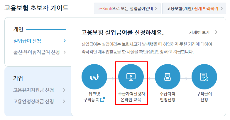 고용보험 홈페이지 수급자격신청자 온라인 교육 수강